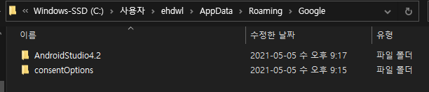 예: ~/Library/Application Support/Google/AndroidStudio4.1 - Linux: ~/.config/Google/AndroidStudio<version> 및 ~/.local/share/Google/AndroidStudio<version>